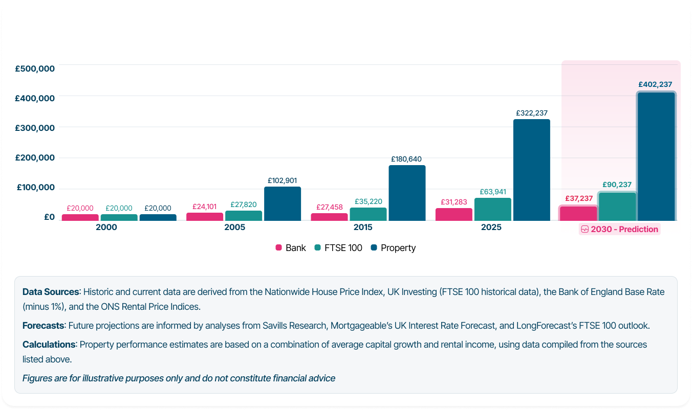 Compared to a typical savings account earning 2-3%, the difference is stark. £100,000 in property can generate over £25,000 in rent across five years, plus substantial capital growth. The same money left in cash? Closer to £116,000, before tax and inflation eat into it.